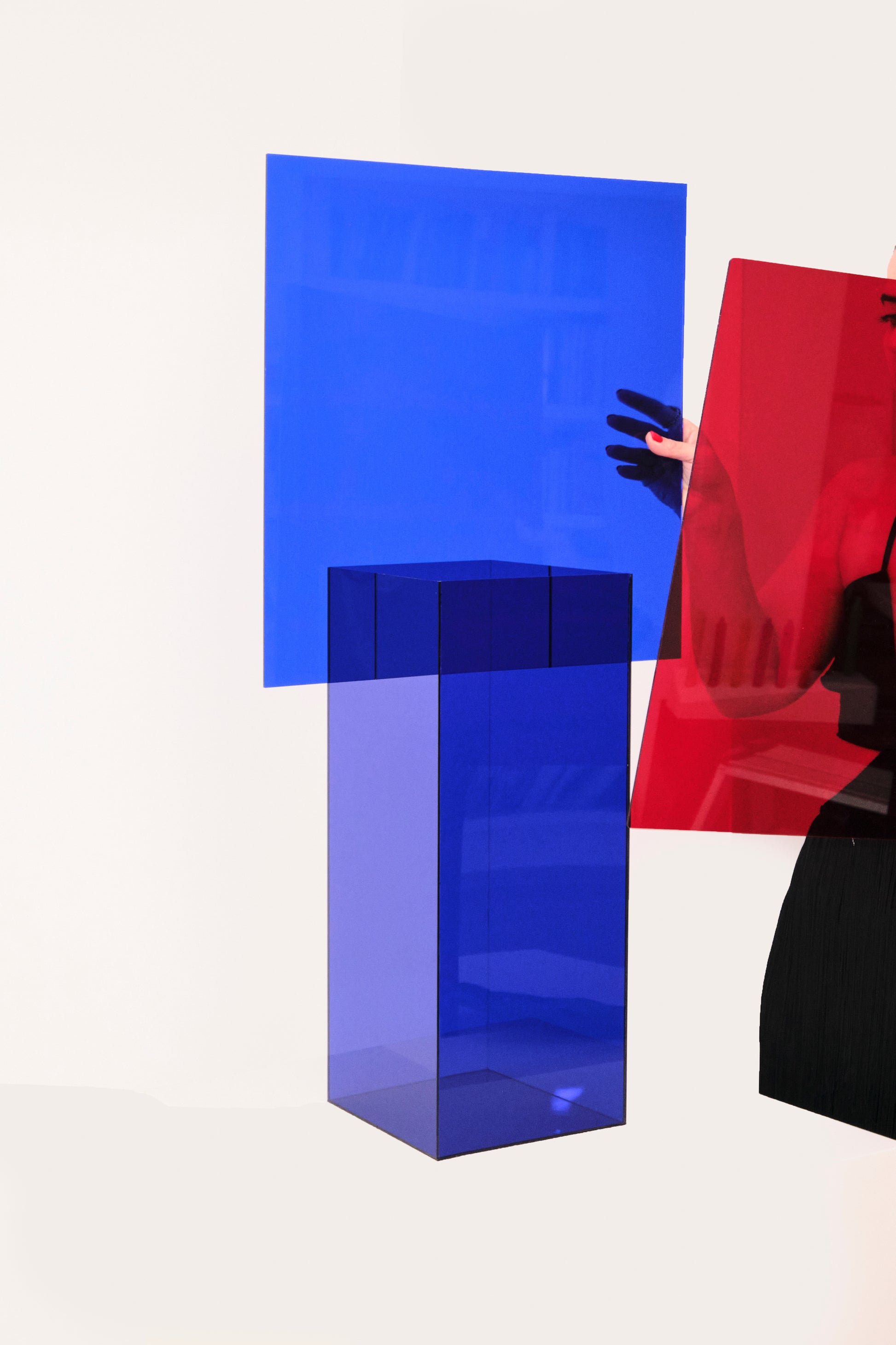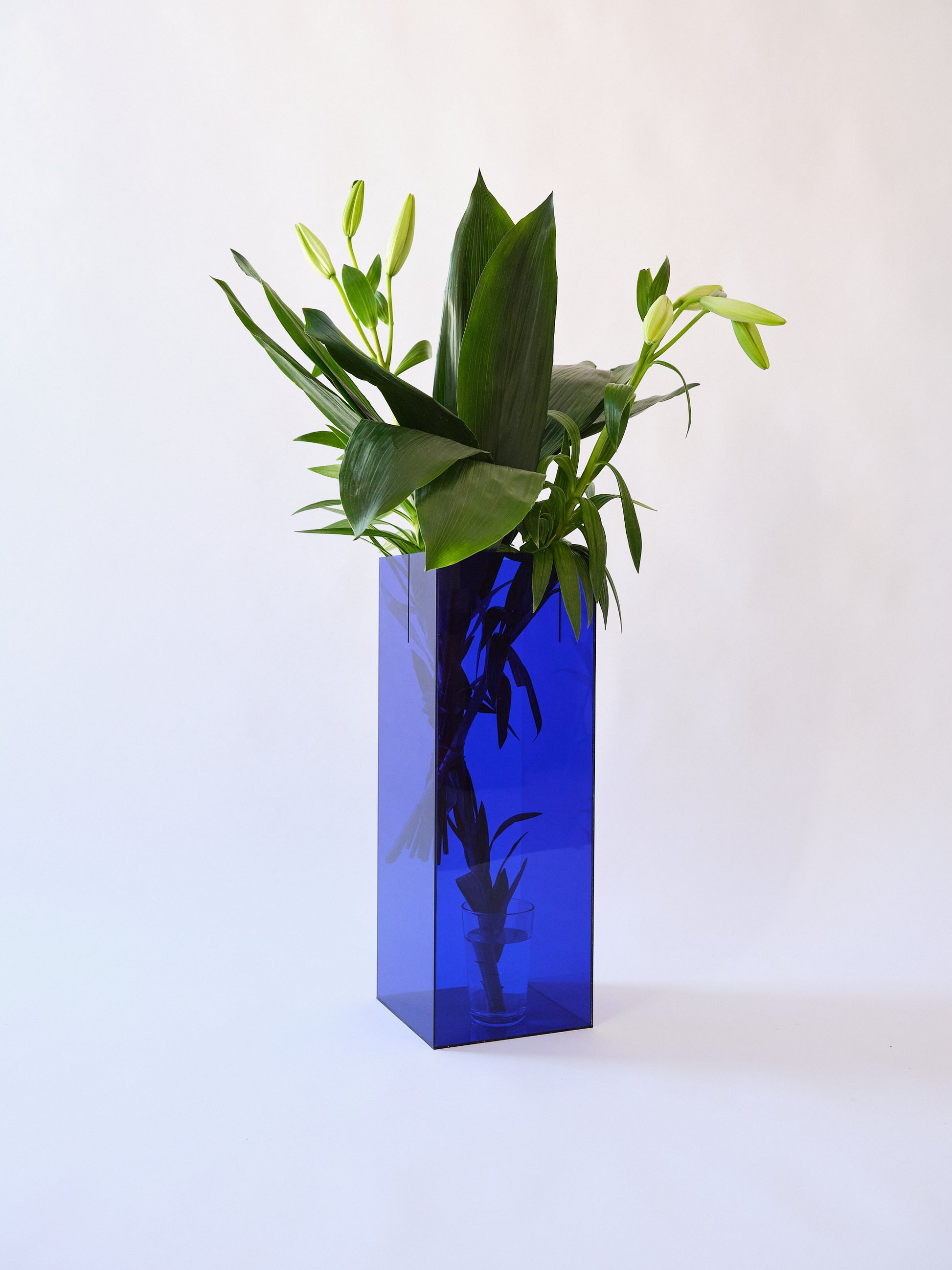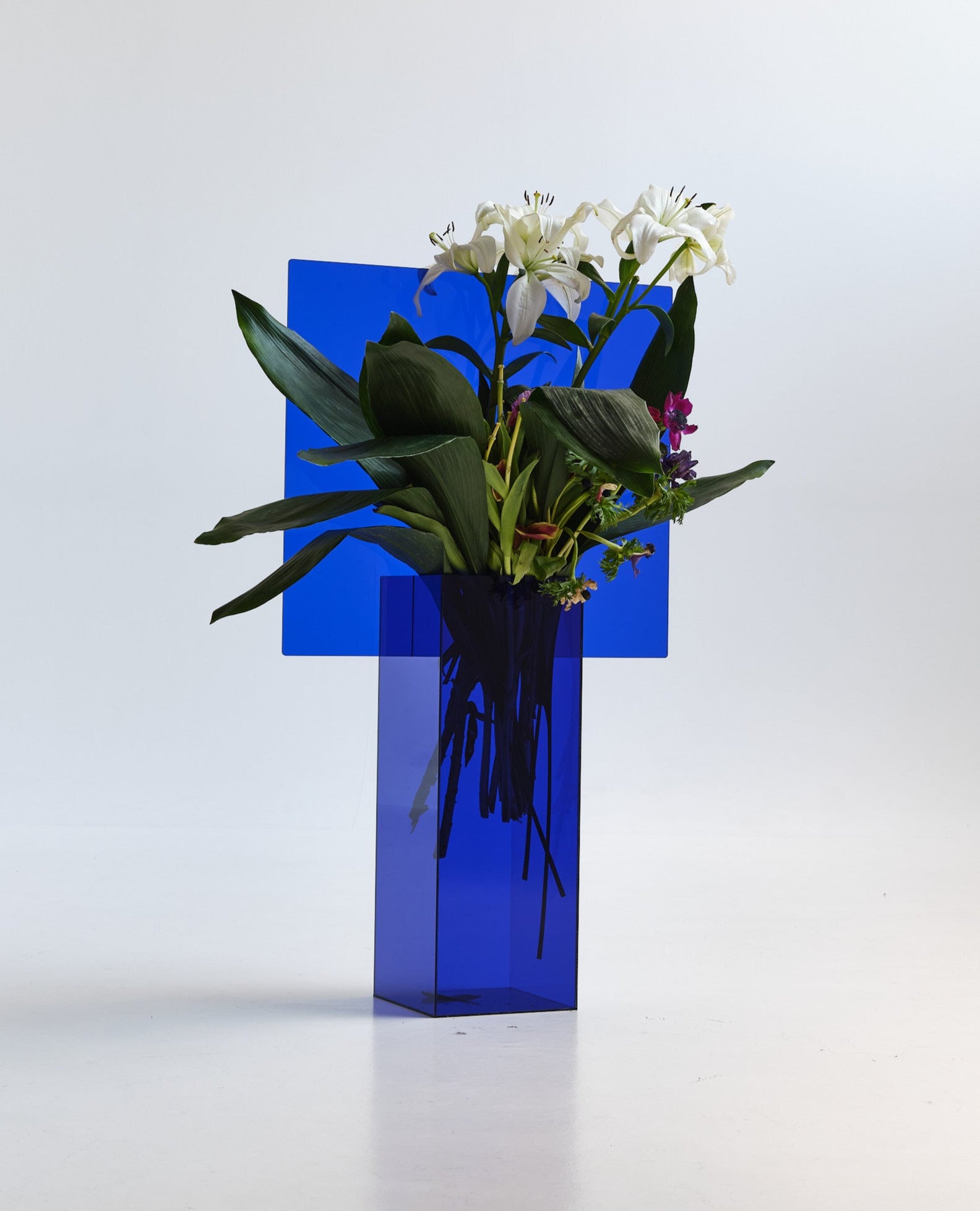 Polymorphic vase, the base is blue and the blue extra piece can be worn horizontally and vertically or not at all depending the mood..